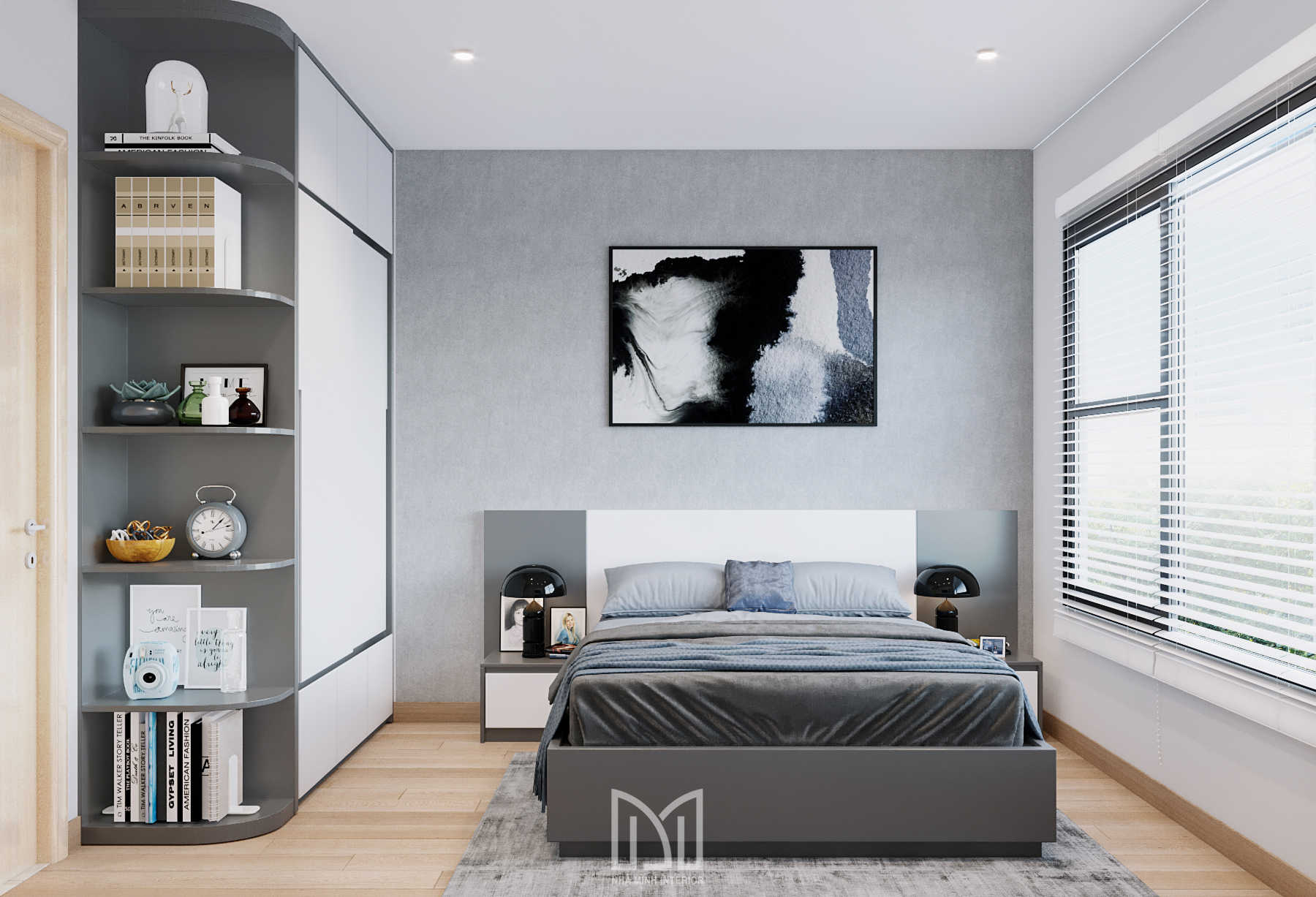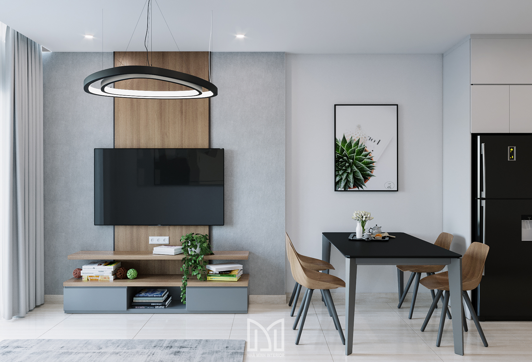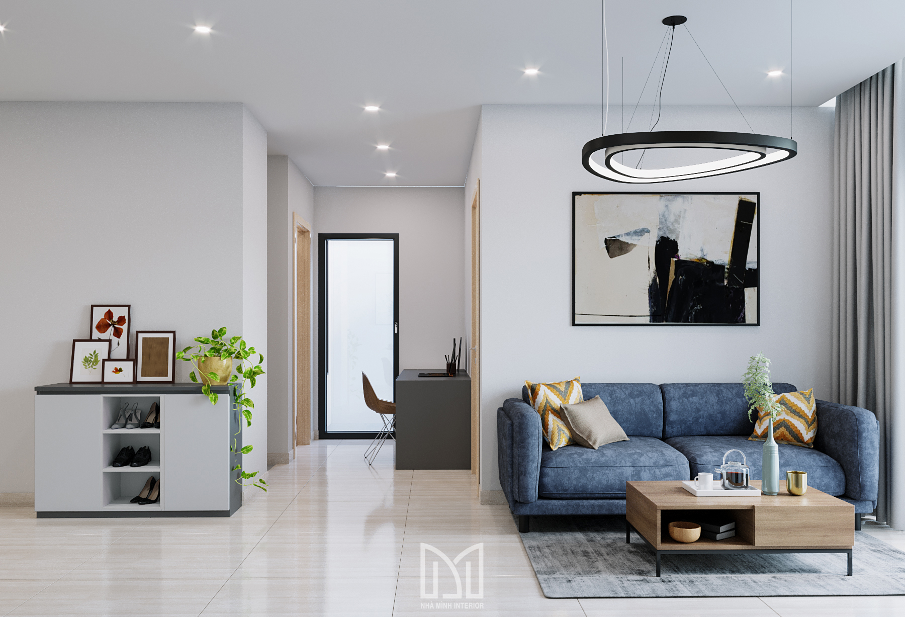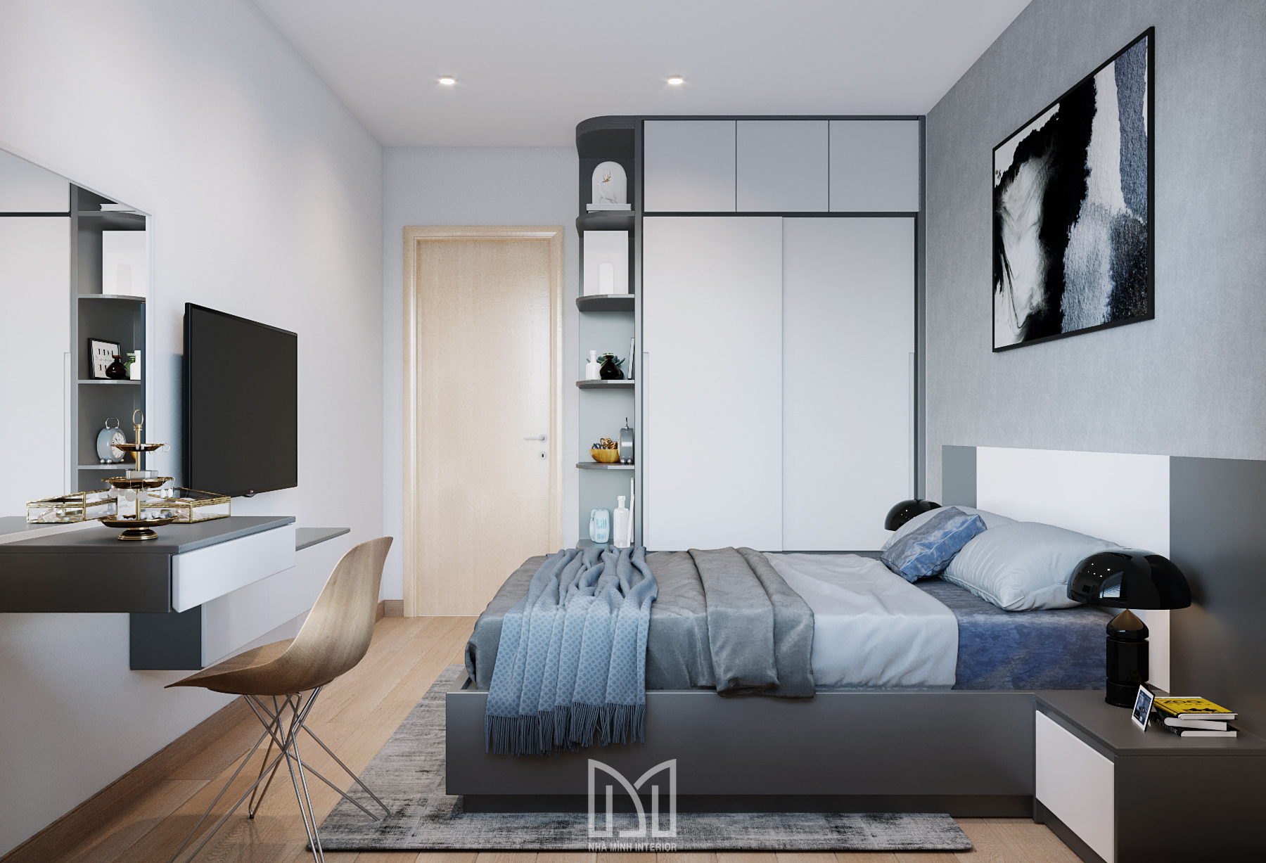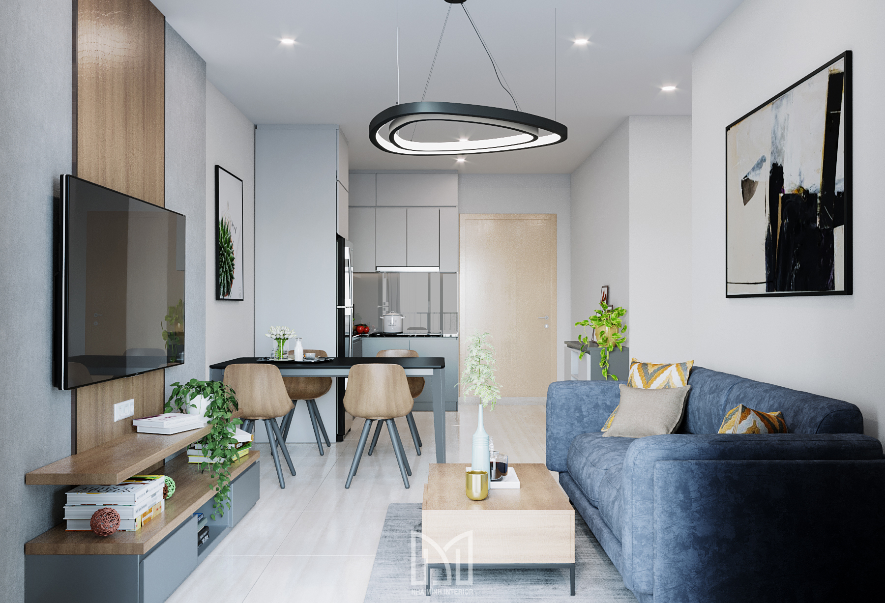 Nội thất trắng xám cùng với màu gỗ và điểm thêm chút xanh dương mang đến sự hài hòa dễ chịu cho gia chủ.