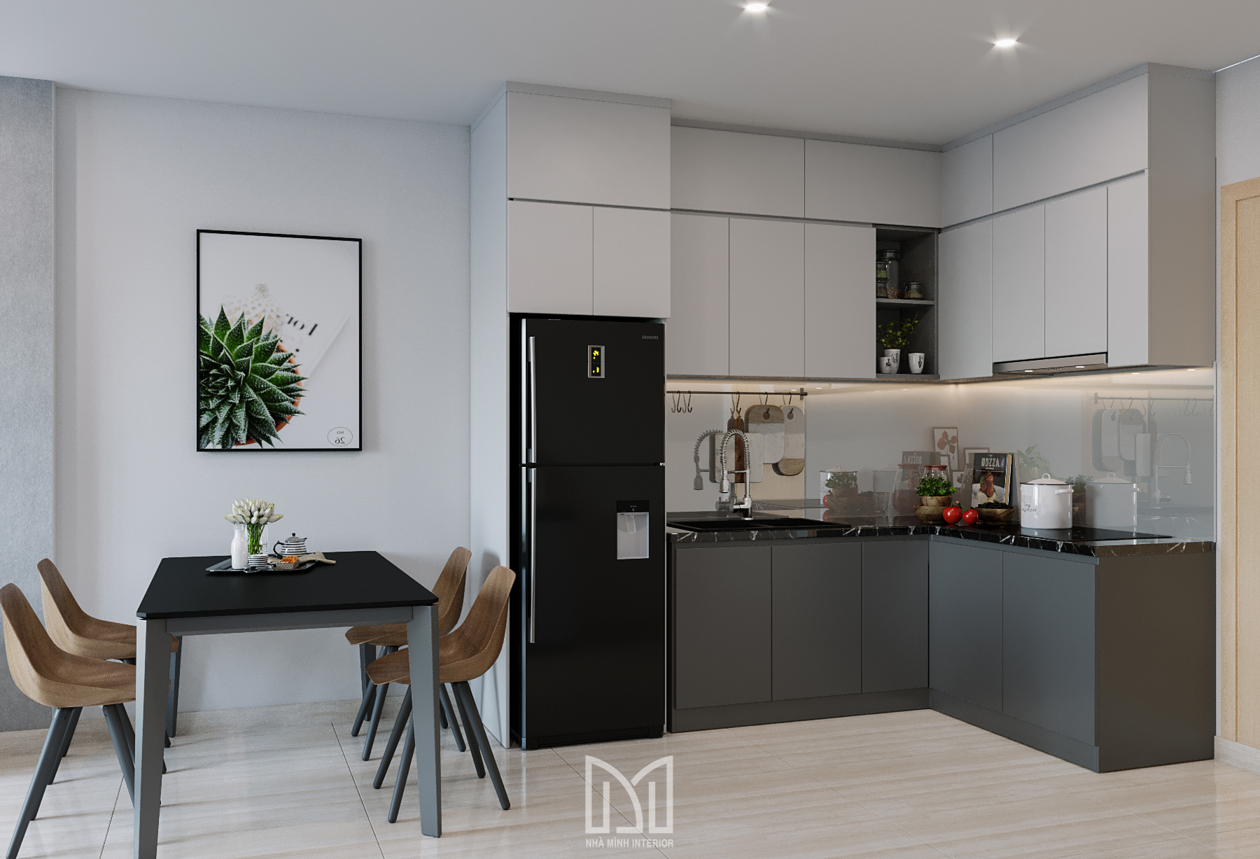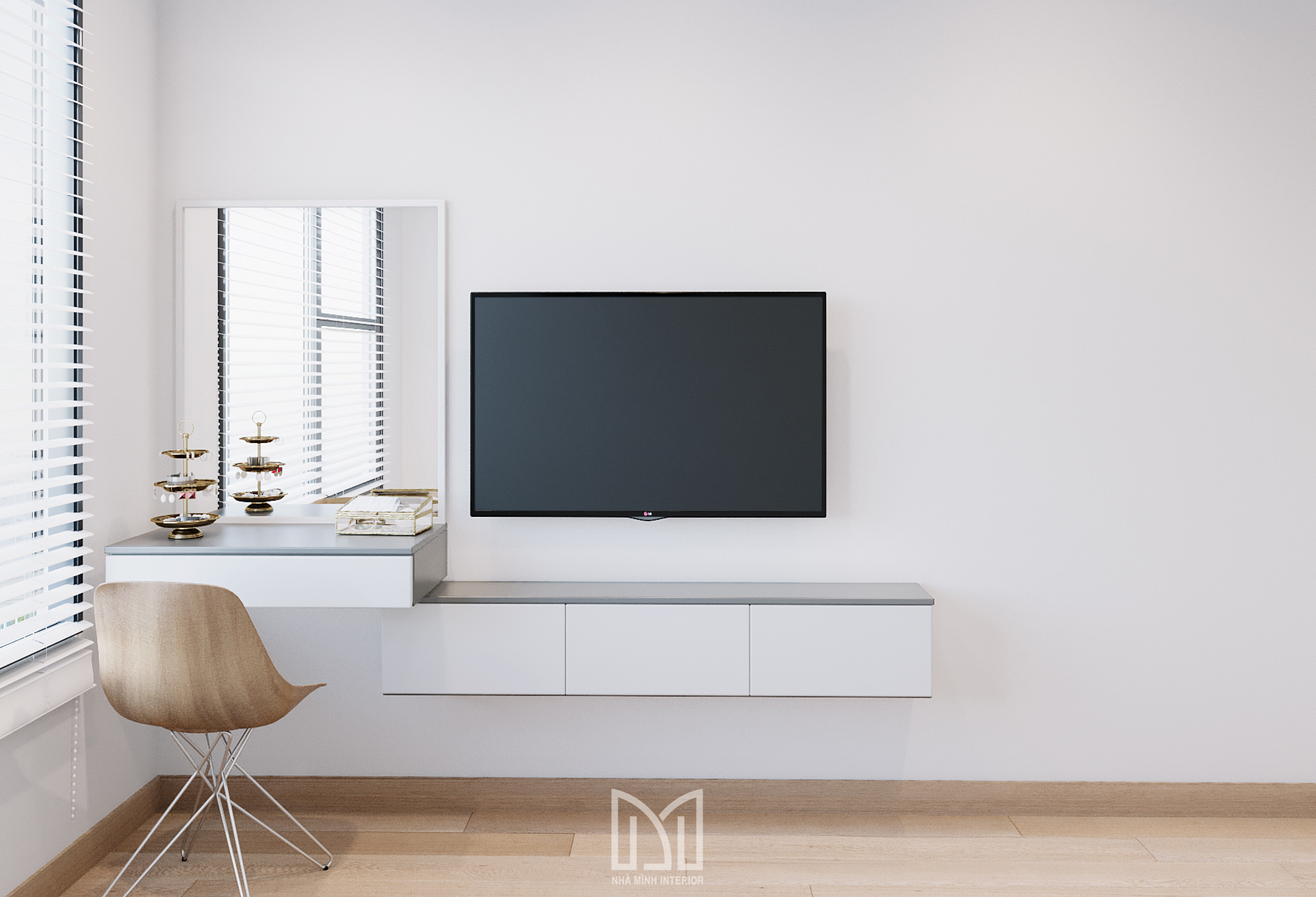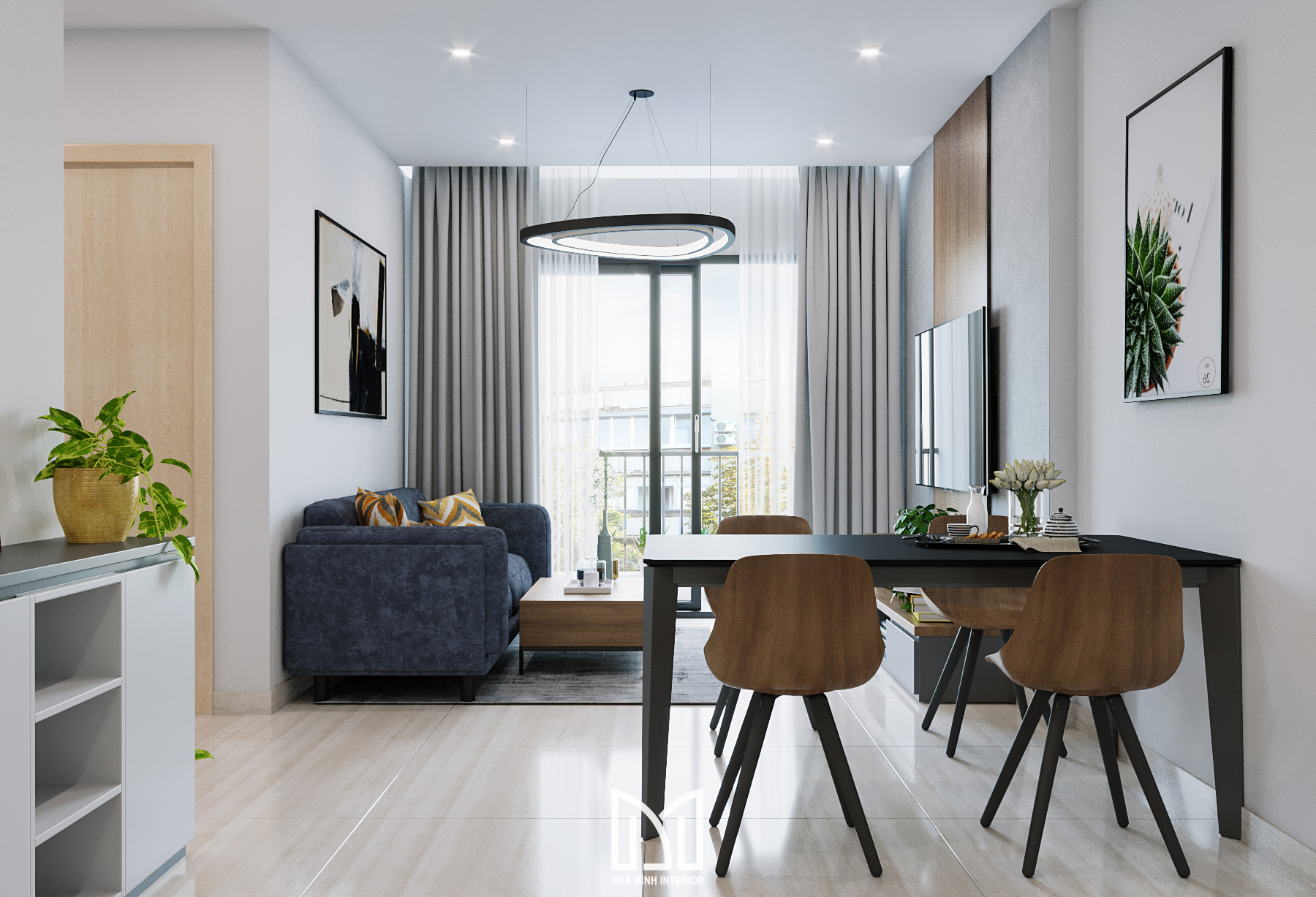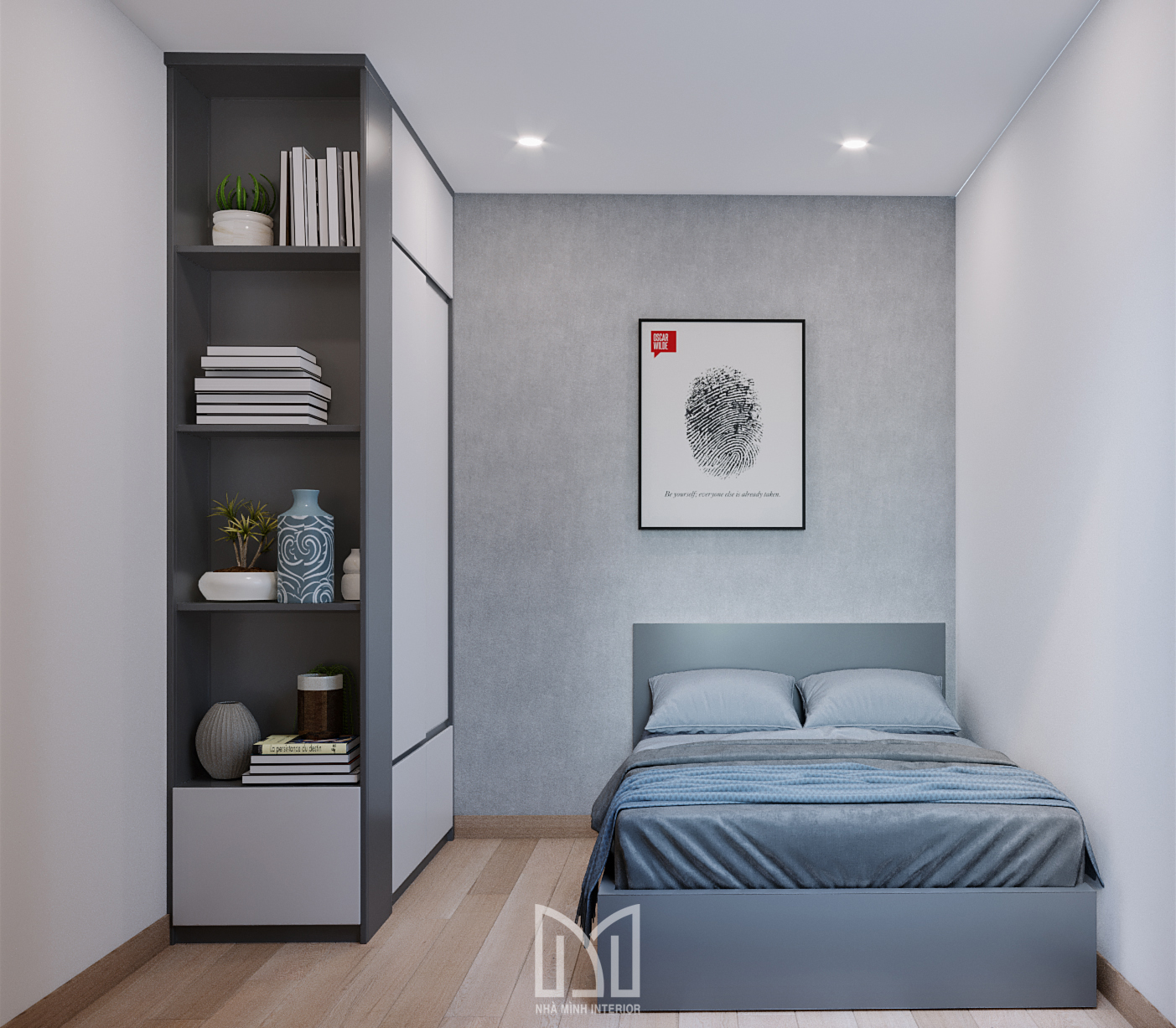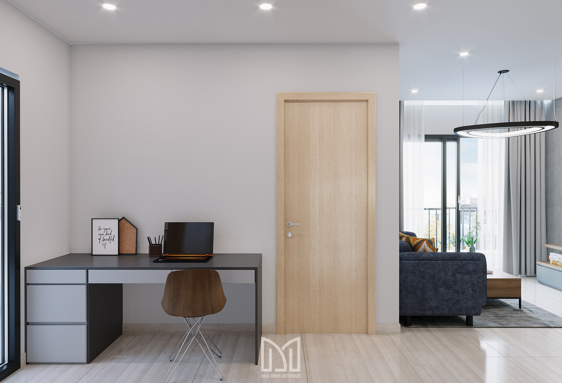 Nội thất trắng xám cùng với màu gỗ và điểm thêm chút xanh dương mang đến sự hài hòa dễ chịu cho gia chủ.
