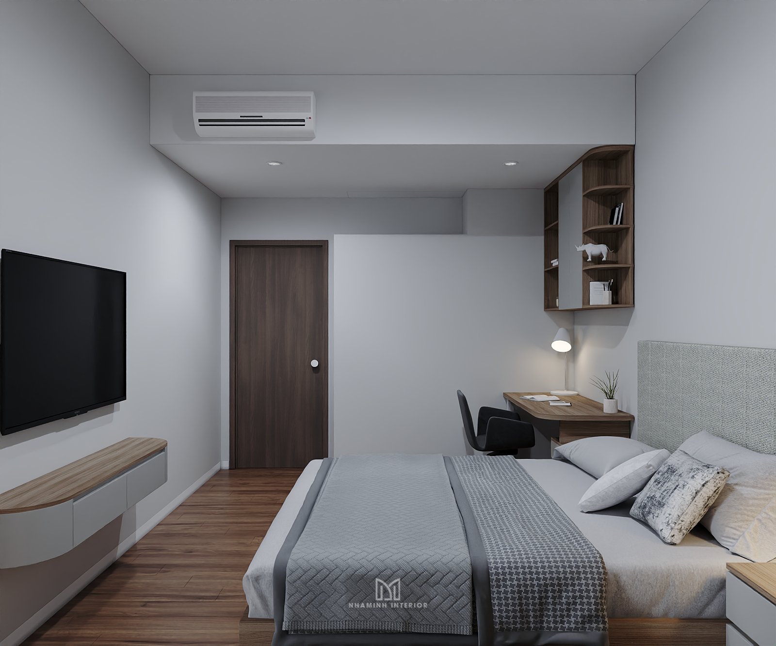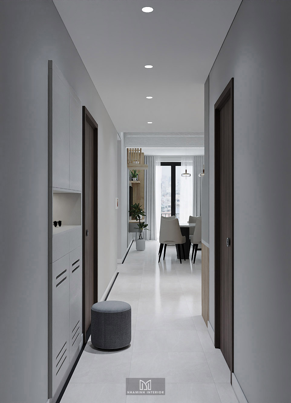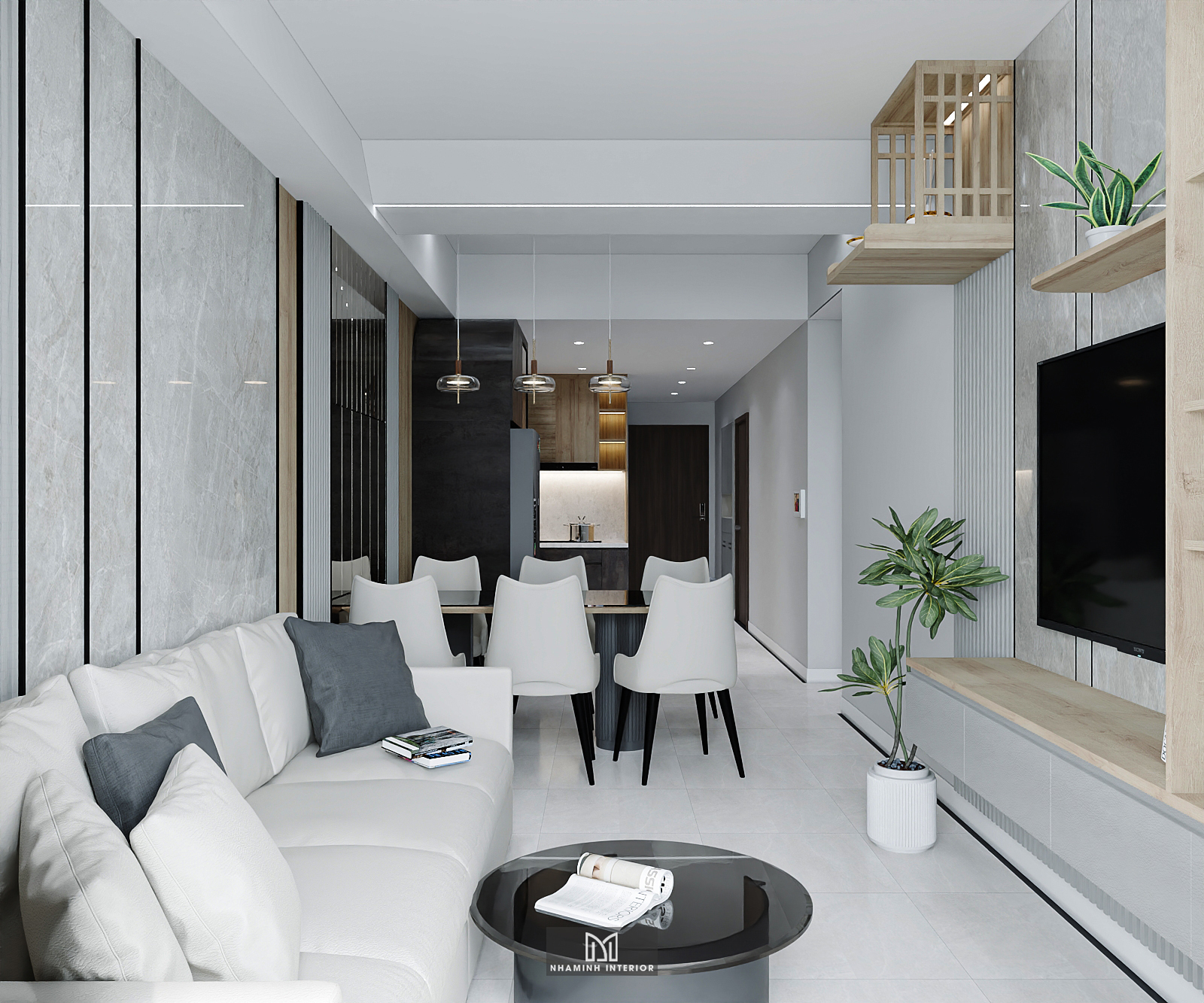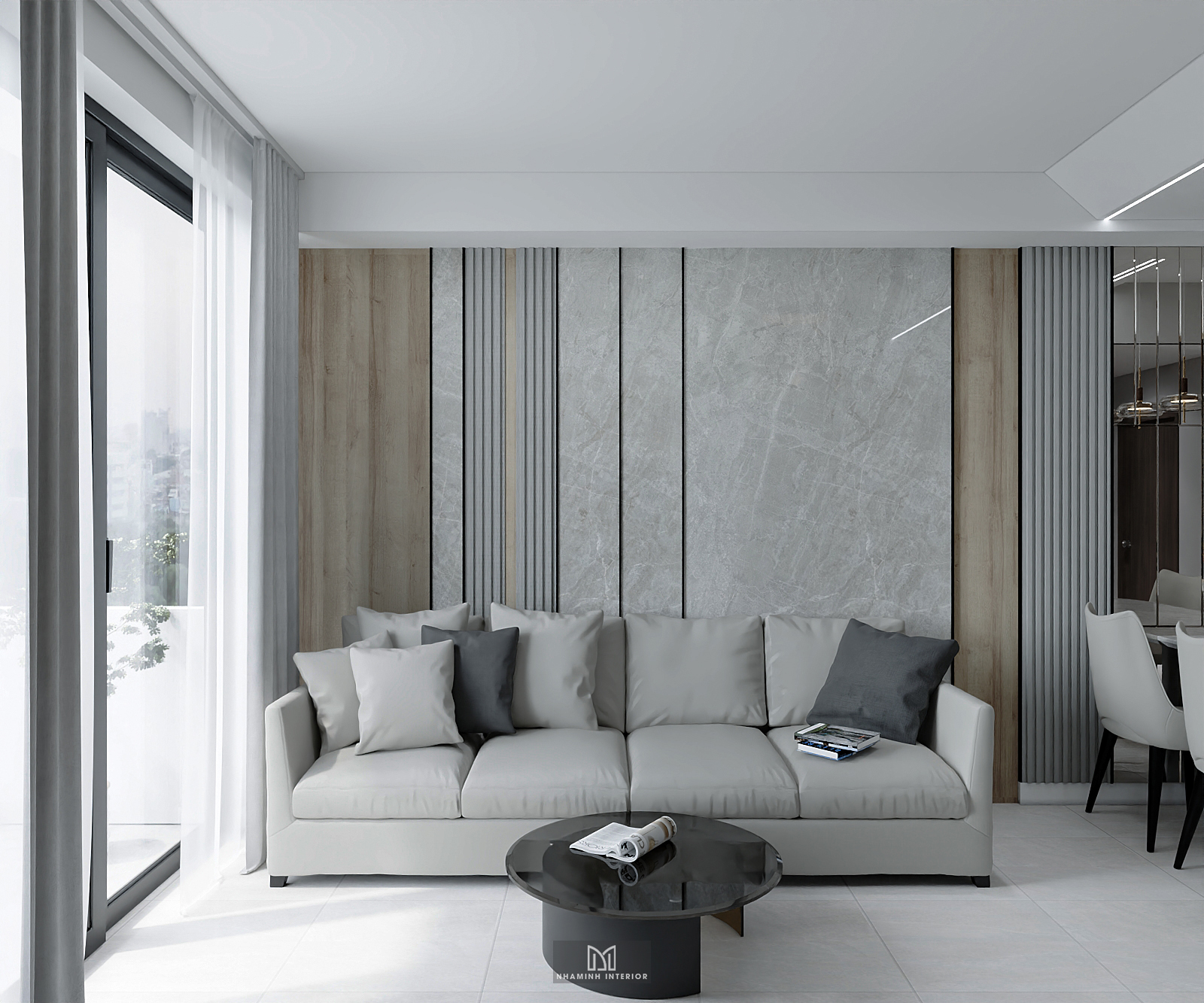 Căn hộ 2PN với sự kết hợp hài hòa giữa màu xám nhạt và gỗ sáng, đem lại cảm giác rộng rãi, thoáng đãng, hiện đại, và tinh tế.