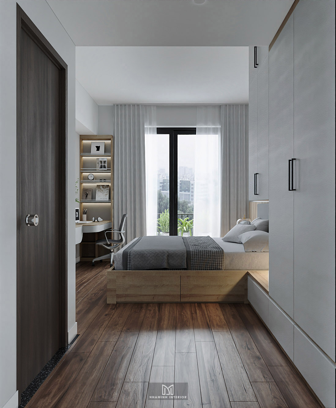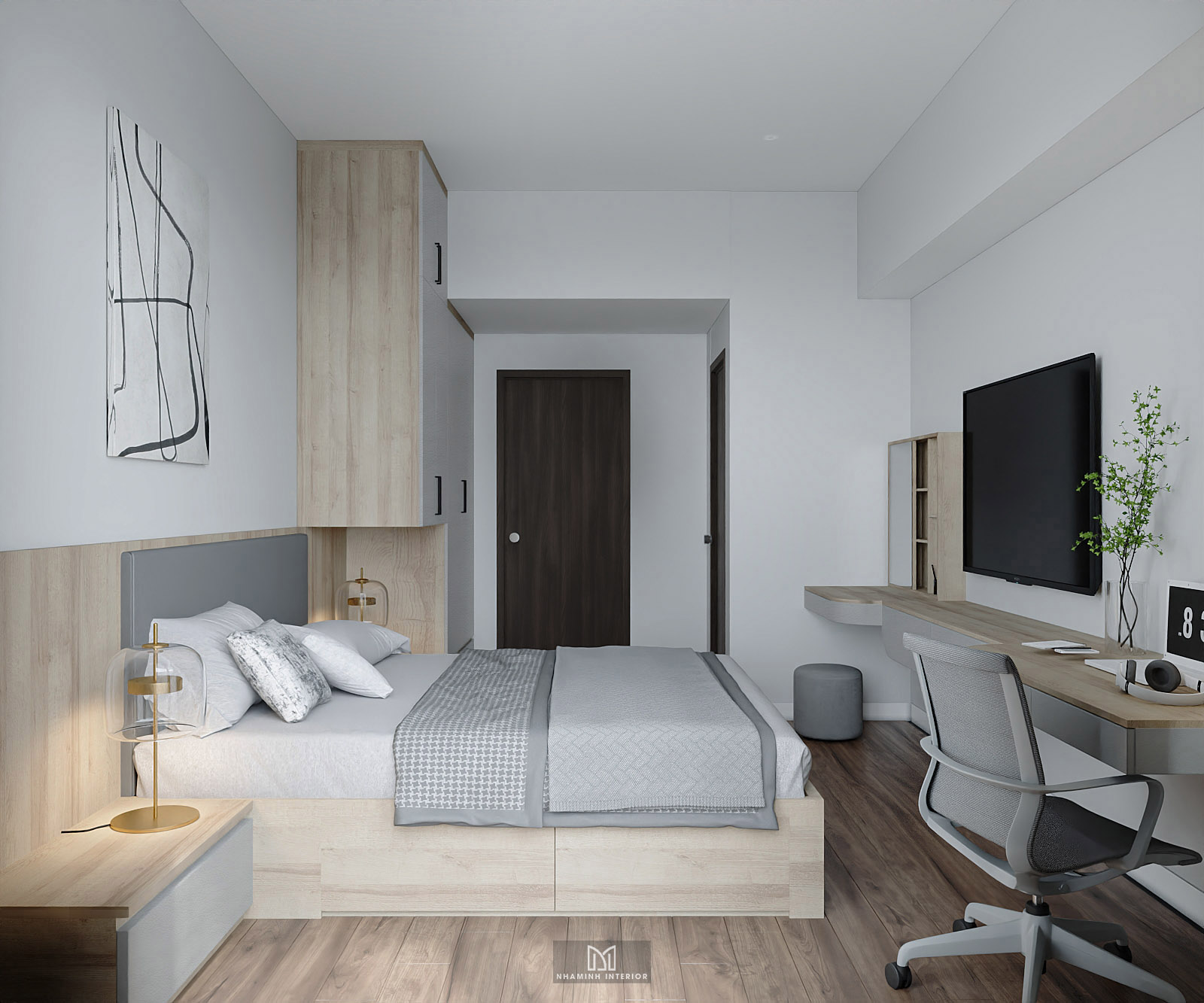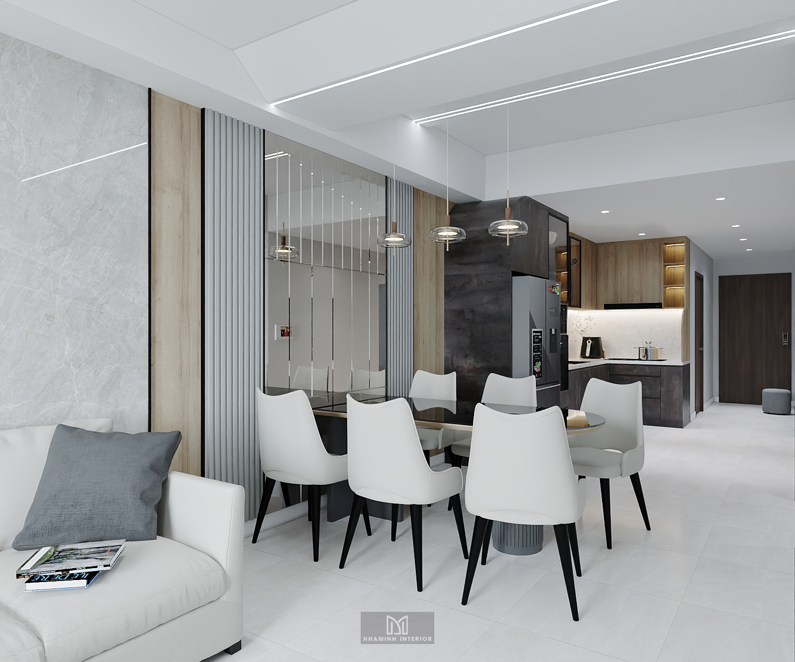 Căn hộ 2PN với sự kết hợp hài hòa giữa màu xám nhạt và gỗ sáng, đem lại cảm giác rộng rãi, thoáng đãng, hiện đại, và tinh tế.