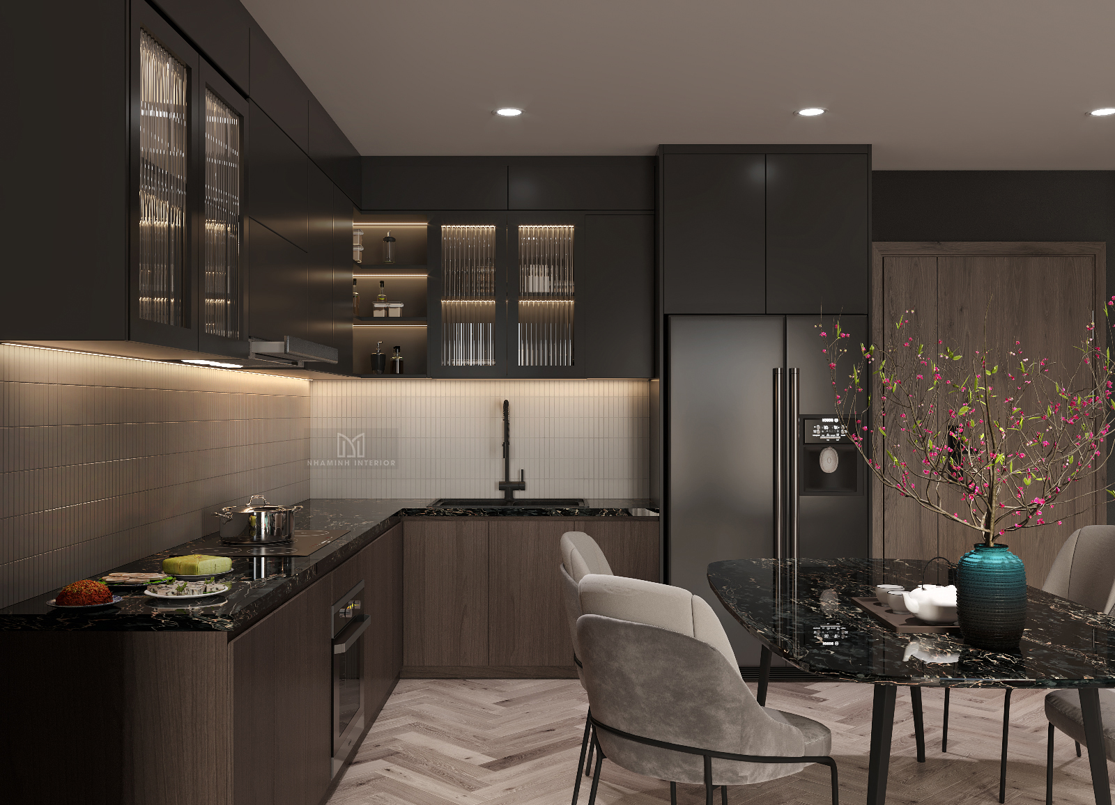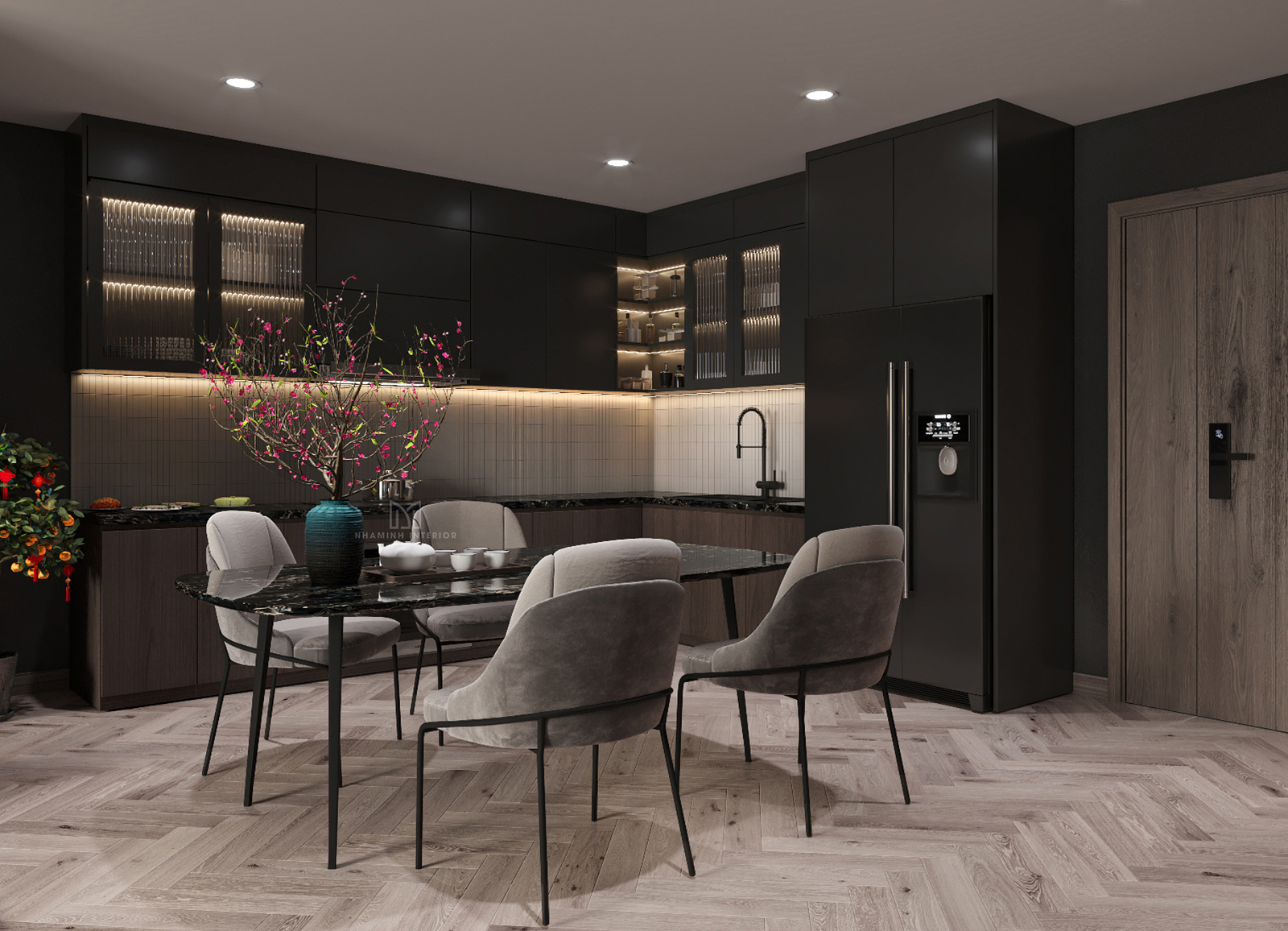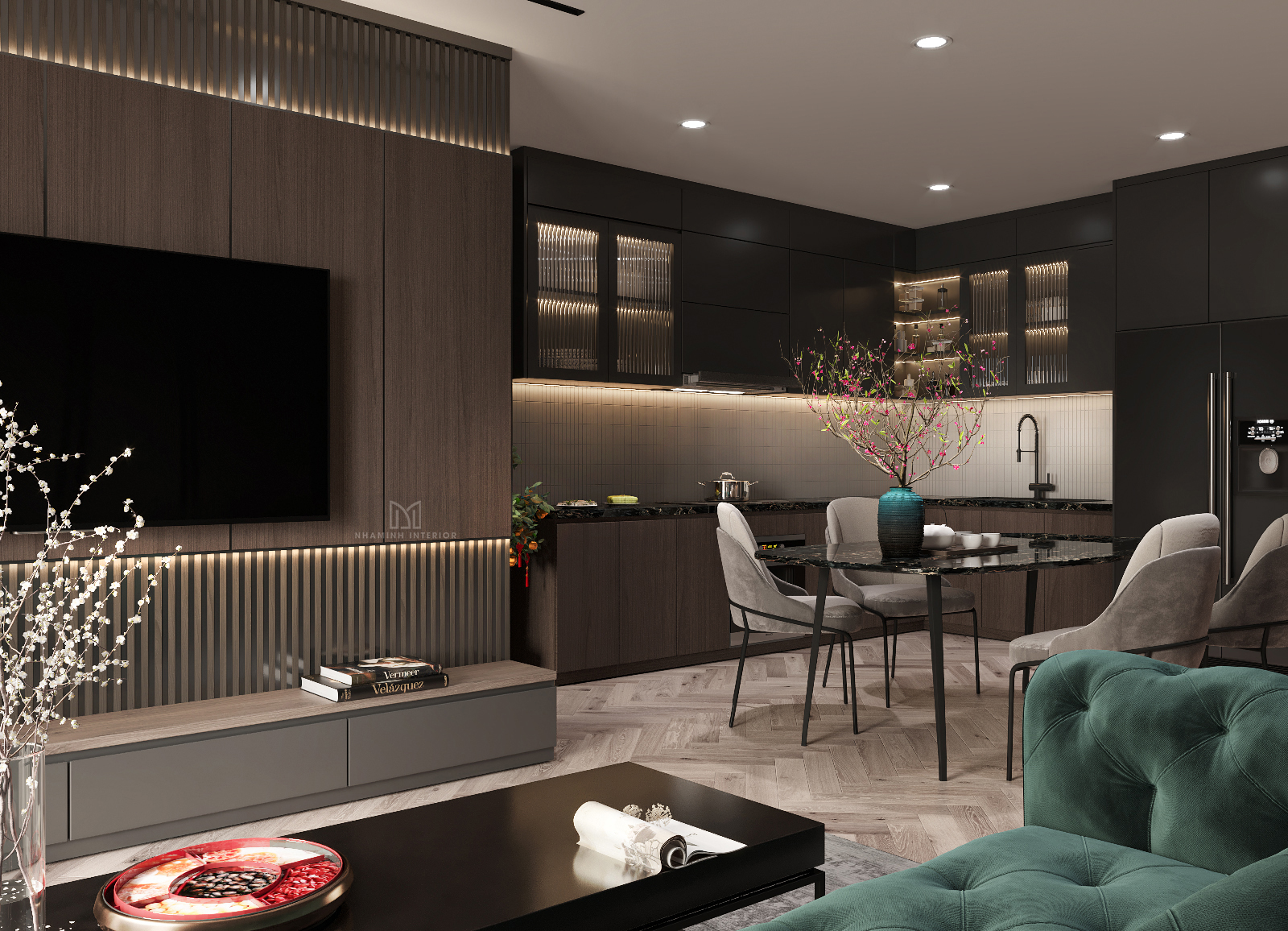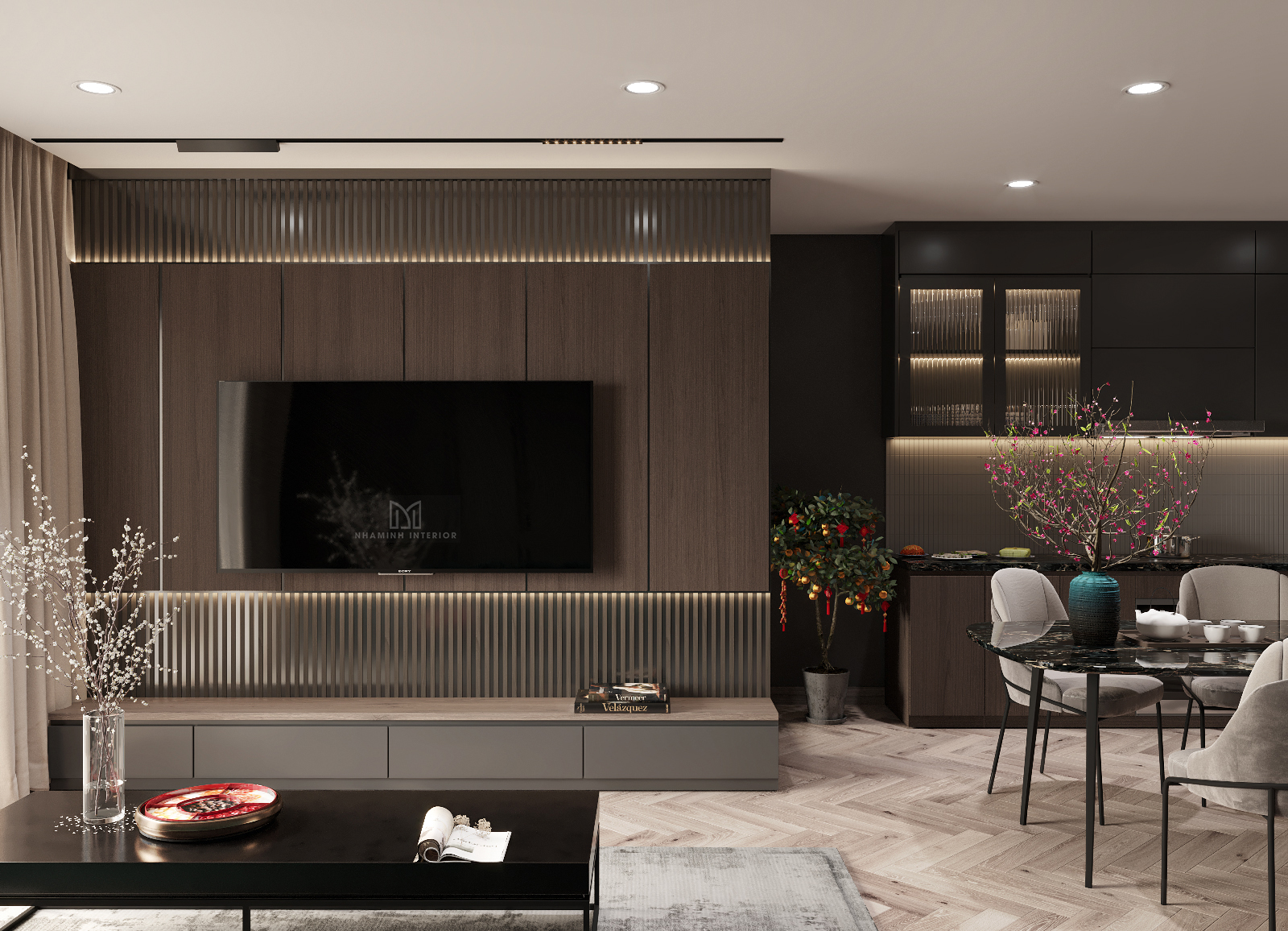Màu đen chủ đạo kết hợp với gỗ sẫm màu đem lại cảm giác sang trọng cho không gian phòng khách.